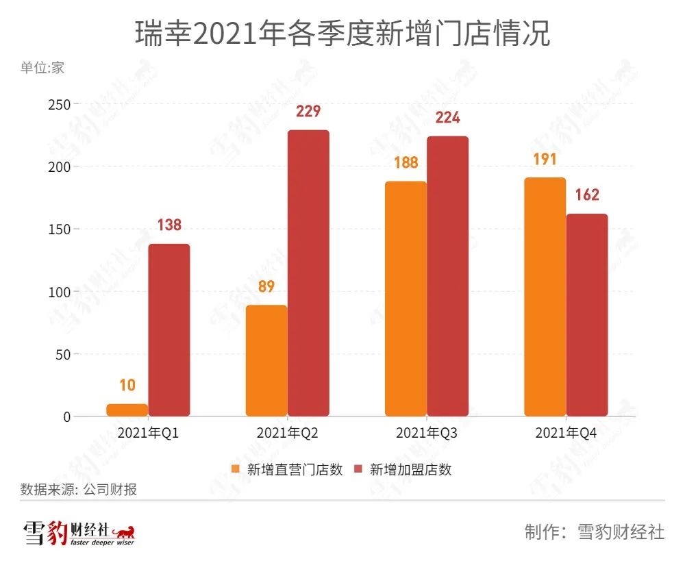 自2021年1月宣布“0加盟费”放开加盟以来,财报数据显示,2021年,瑞幸新增加盟店753家,接近新增直营店数量(468家)的两倍。