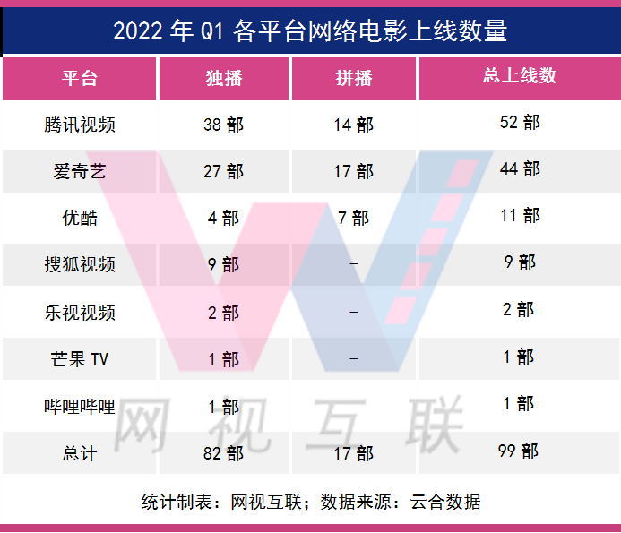 据云合数据提供给网视互联的数据,2022年第一季度爱奇艺、优酷、腾讯视频、搜狐视频、乐视、芒果TV等视频平台上线网络电影共计99部。就上线数量而言,同比2021下滑了43%。