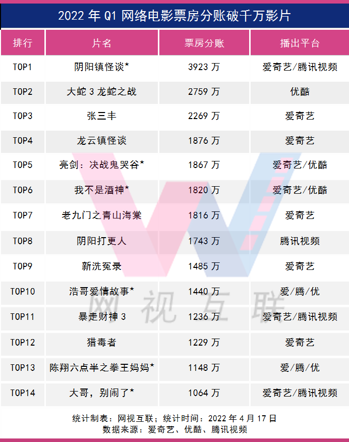 据网视互联统计,2022第一季度(截至3月31日)爱奇艺、腾讯视频、优酷上新网络电影公开分账票房总规模为4.6亿。