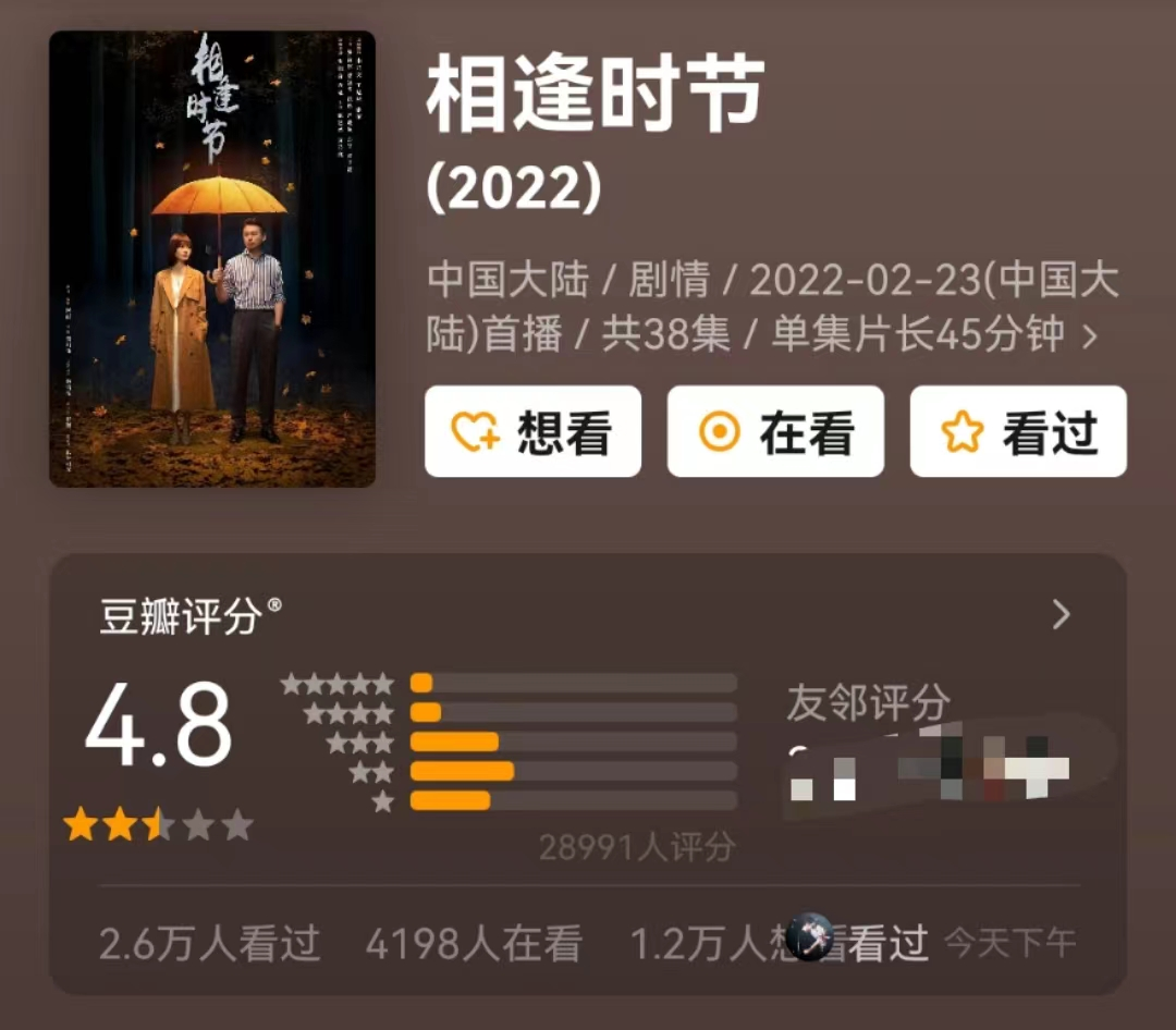 不久前收官的由简川訸执导,雷佳音、袁泉主演的《相逢时节》,就是正午遭遇的“滑铁卢”之一。虽然剧集播出过半后豆瓣依未开分,在国产剧里属于常态现象,但作为正午的剧,就分外罕见了。