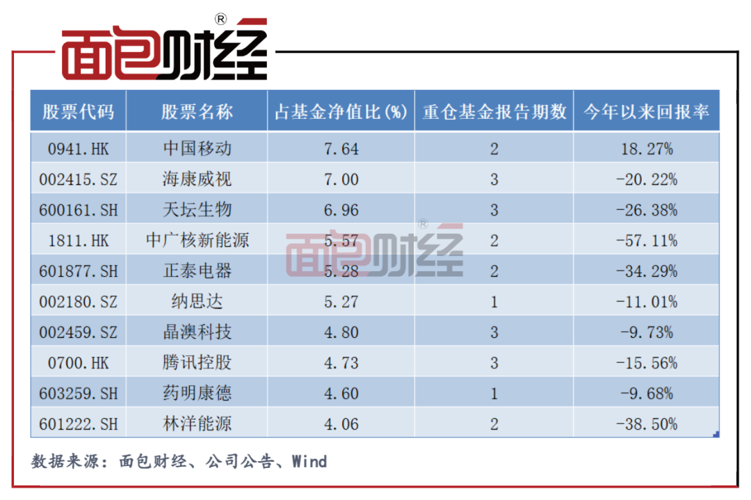 从其2021年末前十大重仓股来看,行业主要分布于信息技术、公共事业、医疗、工业等板块。其中,仅有中国移动在年内出现股价上涨,其他股票则全员下跌,中广核新能源跌幅更是超过55%。持有期相对较长的股票如海康威视、天坛生物、腾讯控股,自去年下半年以来的股价跌幅均超过30%。
