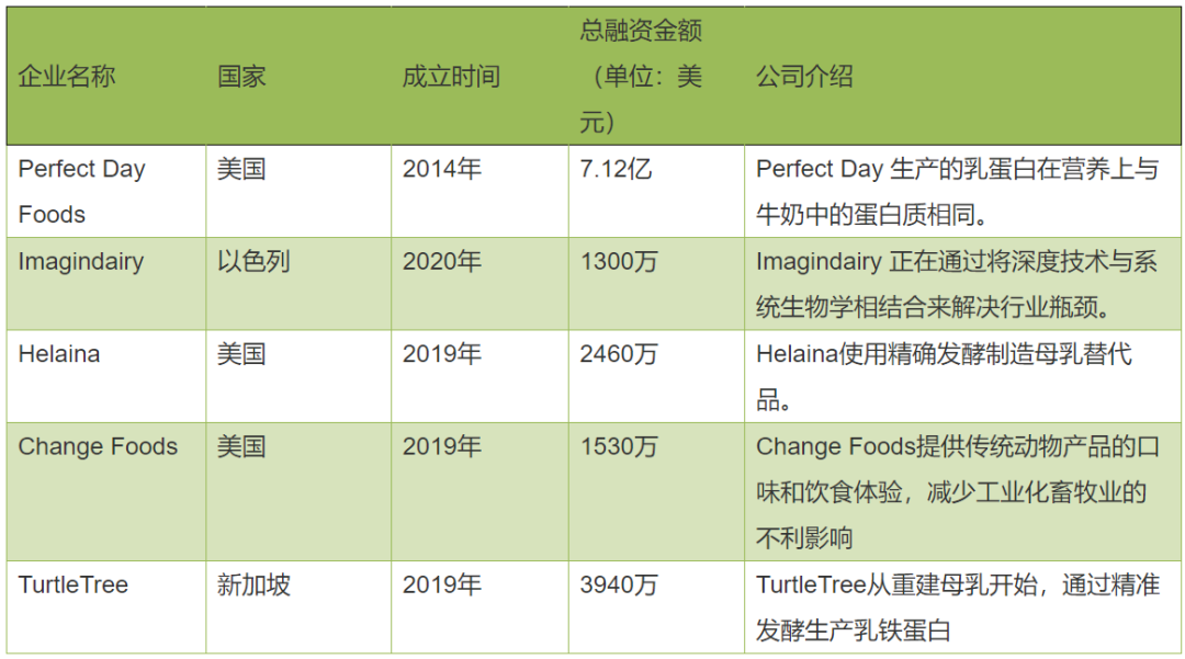 其联合创始人Eyal Afergan表示,“一旦我们实现商业化,更多的消费者将能享受到吃无动物乳制品的乐趣。人们在面对他们喜欢的食物方面很难做出大的改变,但当有一种口味和体验更加符合他们价值观的替代品时,就变得容易了。”Imagindairy于2021年11月宣布完成1300万美元的种子轮融资,预计利用种子资金扩大团队规模并提高研发能力。 此外,还有Helaina、Change Foods、TurtleTree等公司通过精准发酵制造实验奶,部分公司一览如下:
