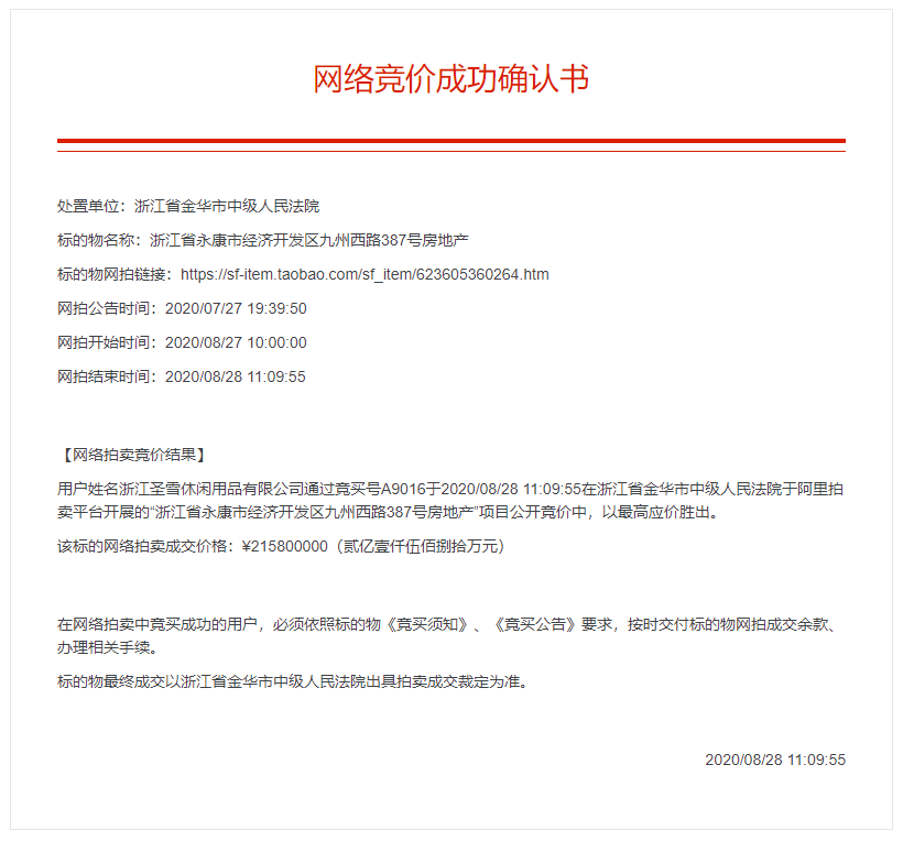 但该厂房在2020年2月和4月的拍卖均被中止,2020年8月,该厂房以评估价1.55亿元、网络拍卖成交价2.16亿元被浙江圣雪休闲用品有限公司获得。从今天来看超人集团拍卖厂房的“自救”行为,似乎成效并不显著。