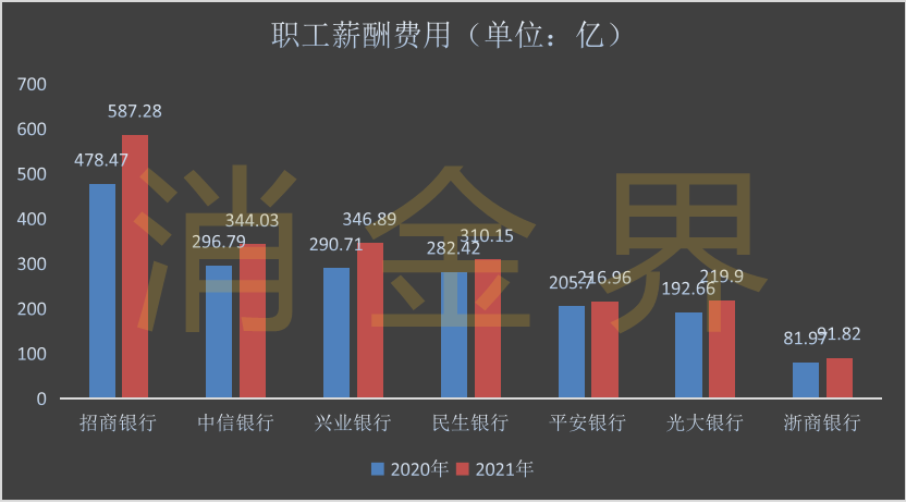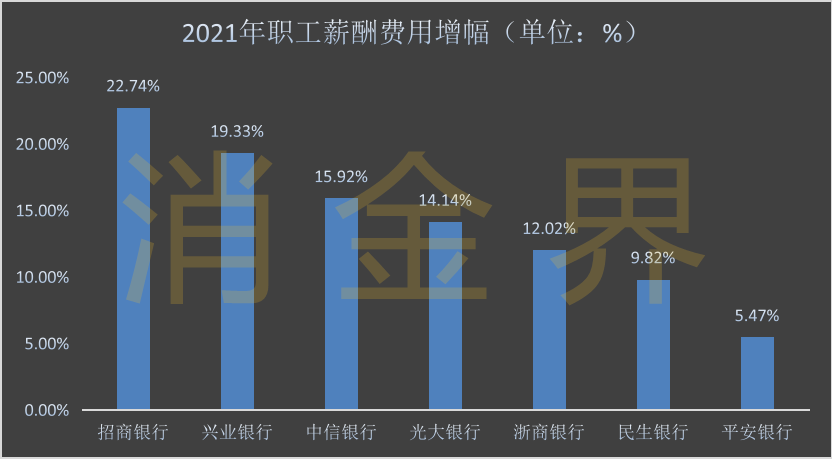 招商银行领衔,职工薪酬费用由2020年的478.47亿,增长到了2021年的587.28亿元,增幅高达22.74%。