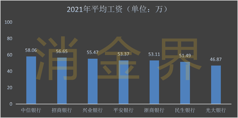 从人均薪酬上看,中信银行排在首位,2021年,中信银行平均工资为58.06万元。招商银行紧随其后,2021年的平均工资为56.65万元,兴业银行为55.47万元,平安银行为53.37万元,浙商银行为53.11万元,民生银行为51.49万元,光大银行为46.87万元。
