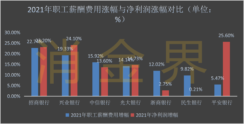 2021年,平安银行净利润增速为25.6%,位居上市股份行首位。而职工薪酬费用增幅为5.47%,在上市股份行中垫底。