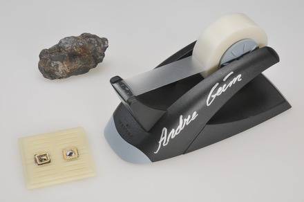 安德烈海姆捐送给诺贝尔博物馆的一卷塑料胶袋,石墨块,和石墨烯晶体