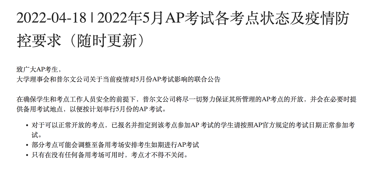 4月18日,中国大陆AP考试承办方普尔文发布最新通知称,受疫情影响,原定于5月2日开始的上海、苏州、南通三个地区AP考试考场取消。大学理事会(College Board,下称CB)和普尔文正在积极评估是否会提供补考机会,将于5月初提供进一步信息。