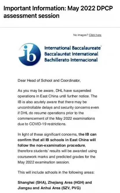 4月12日,IBO官方也正式发函告知华东区各IB学校,取消2022年5月华东地区大考。此次受到影响的区域包括:上海、浙江、江苏和安徽四省市。