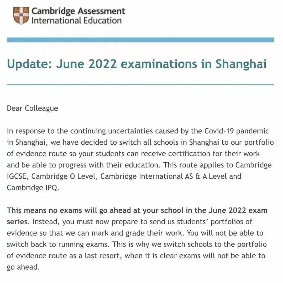 4月11日,CAIE考试局在发给上海地区学校的内部信函中表示,受疫情影响,2022年6月的A-Level (AS与A2),O-Level,IGCSE以及IPQ都将取消统考。取而代之的是将学生的成绩证据集(Portfolio of Evidence)提交给考试局,官方可以批改并给学生成绩。