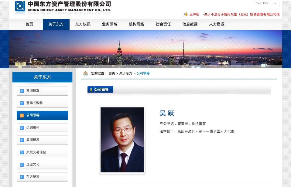 界面新闻记者关注到,截至发稿前,东方资产官网尚未公布王占峰的任命信息。据其官网“公司领导”一栏披露,吴跃的职务仍显示为东方资产党委书记、董事长和执行董事。