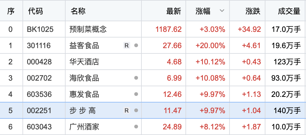 在连续多日被爆炒后后,4月20日,包括步步高在内的5只预制菜概念股涨停。益客食品(301116.SZ)20%涨停、华天酒店(000428.SZ)、海欣食品(002702.SZ)、惠发食品(603536.SH)均涨停,广州酒家(603043.SH)、岭南控股(000524.SZ)等多只个股跟涨。