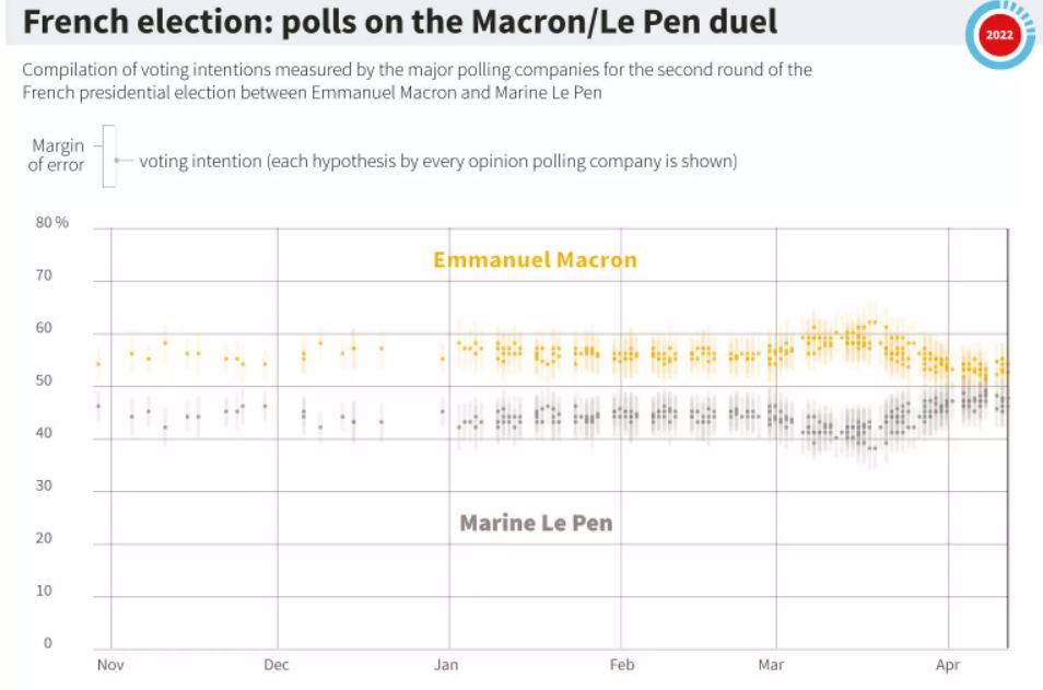 目前多项民调显示,马克龙将在第二轮投票中领先勒庞。但与2017年相比,马克龙对勒庞的优势明显缩小。