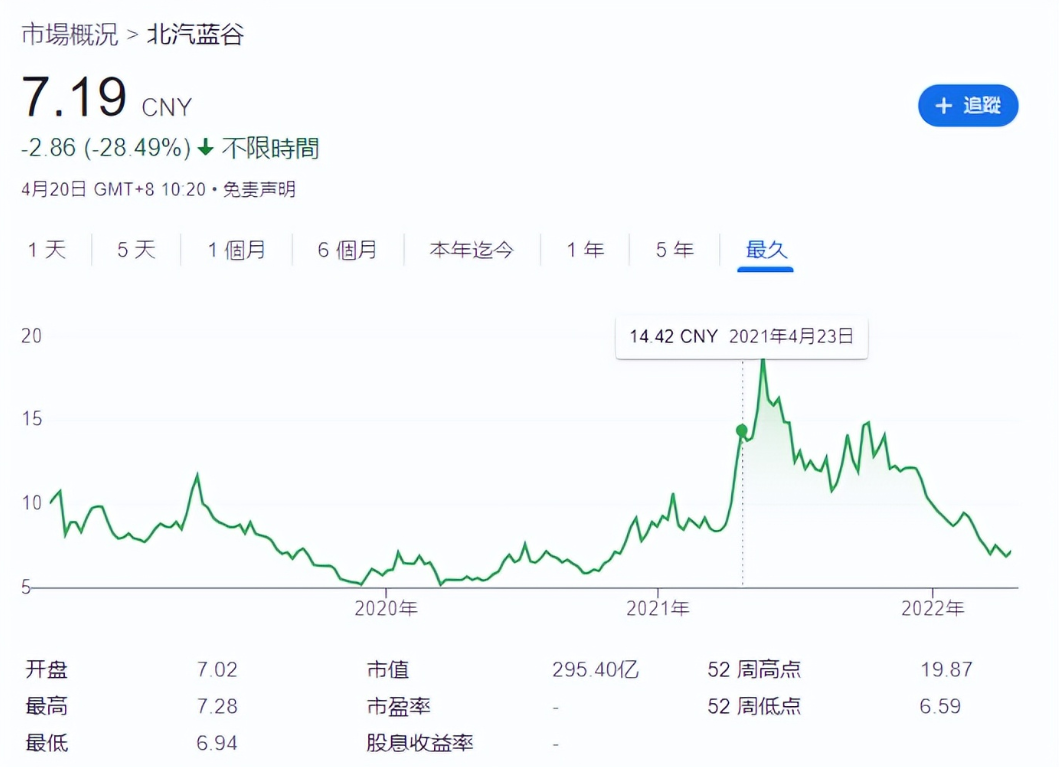 从北汽蓝谷在二级市场的表现,我们同样可以窥见对这一观点的现实性支撑,在去年极狐阿尔法S发布的时间点上,北汽蓝谷股价快速冲到了这几年的最高点,一度超过19元人民币。
