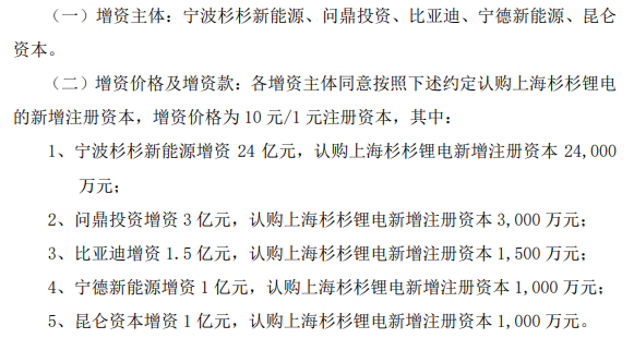 此次增资公告透露了更多细节。具体来看,四位战略投资人——问鼎投资、比亚迪、宁德新能源(ATL)、昆仑资本分别增资3亿元、1.5亿元、1亿元、1亿元,对应分别认购上海杉杉锂电新增注册资本3000万元、1500万元、1000万元、1000万元。