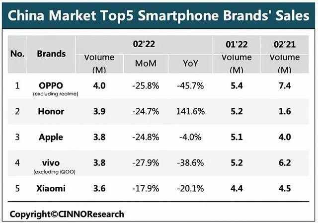 不久前,市场调研机构CINNOResearch发布的数据显示,2022年2月,中国智能手机市场的总销量约为2348万部,同比下跌20.5%,环比下跌24%。