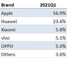 同时,据搜狐科技公开的IDC数据显示,2020年上半年,国内600美元以上价位段手机市场份额排名中,前Top5分别是华为(44.1%)、苹果(44%)、小米(4%)、三星(2.9%)、OPPO(2.6%)。到了2021年第一季度,550美元以上价位段内排名为苹果(56.9%)、华为(23.6%)、小米(5.8%)、vivo(5.1%)、OPPO(5.0%)。