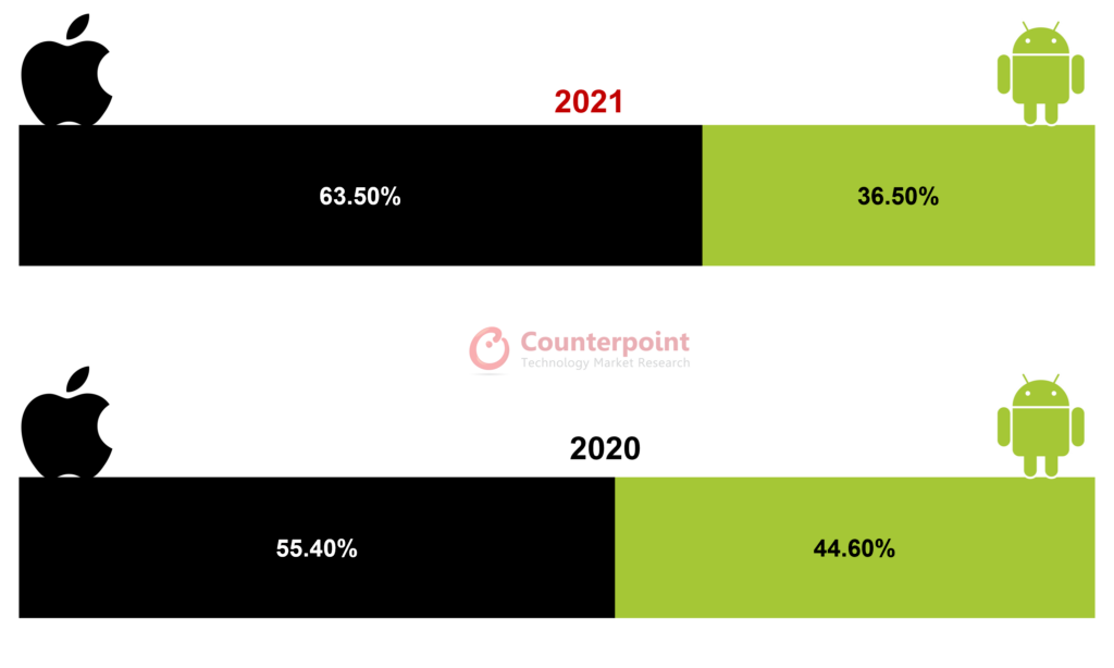 据市场调研机构Counterpoint发布的最新报告显示,2021年国内市场600美元(约合3800元)以上价位,Android手机的市场份额从2020年的44.6%跌至36.5%,而苹果市场份额则从55.4%提升到了63.5%。