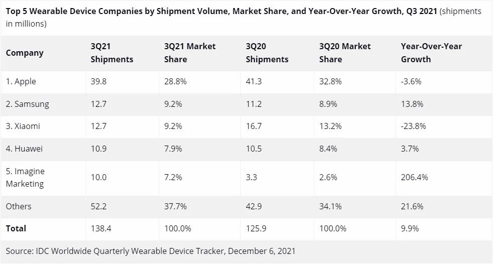 在智能穿戴领域方面,根据IDC统计的数据,截止2020年第四季度,华为在中国智能穿戴市场占据着22.3%的份额,小米和苹果同为19%,三大巨头垄断了超过60%的市场份额。