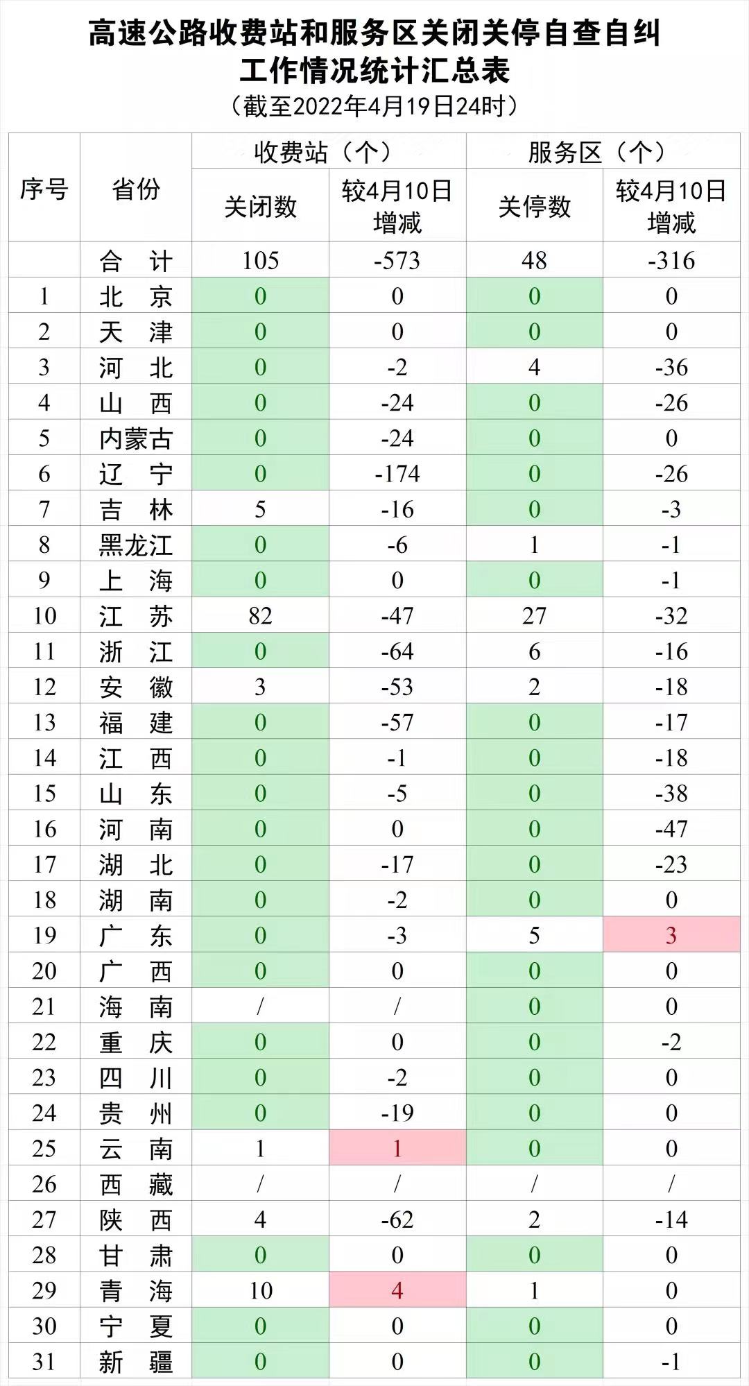 交通运输部微信公众号消息,根据各省(区、市)上报数据汇总统计,受疫情影响,截至2022年4月19日24时,各省(区、市)高速公路共关闭收费站105个,占收费站总数的0.97%,比4月10日减少573个,下降了84.51%;共关停服务区48个,占服务区总数的0.73%,比4月10日减少316个,下降了86.81%。除西藏(无高速公路收费站和服务区)外的30个省(区、市)中,北京、天津、山西、内蒙古、辽宁、上海、福建、江西、山东、河南、湖北、湖南、广西、海南、重庆、四川、贵州、甘肃、宁夏、新疆等20个省份已无关闭关停的高速公路收费站和服务区。