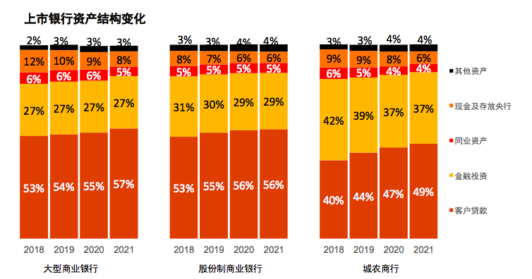 在贷款结构上,上市银行呈现差异化特征。大型商业银行持续发挥大行作用,积极支持国家重大战略、重要项目落地,服务实体经济,其公司贷款占比较2020年进一步增加至55%;股份制商业银行和城农商行零售类贷款占比逐年提高,这主要与它们近年来聚焦于零售转型、进行差异化经营布局相关。