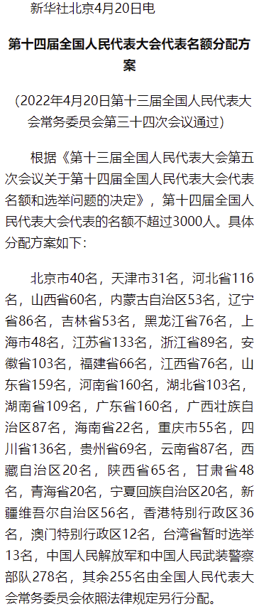 新华社4月20日消息,《第十四届全国人民代表大会代表名额分配方案》(2022年4月20日第十三届全国人民代表大会常务委员会第三十四次会议通过)公布,具体内容如下。
