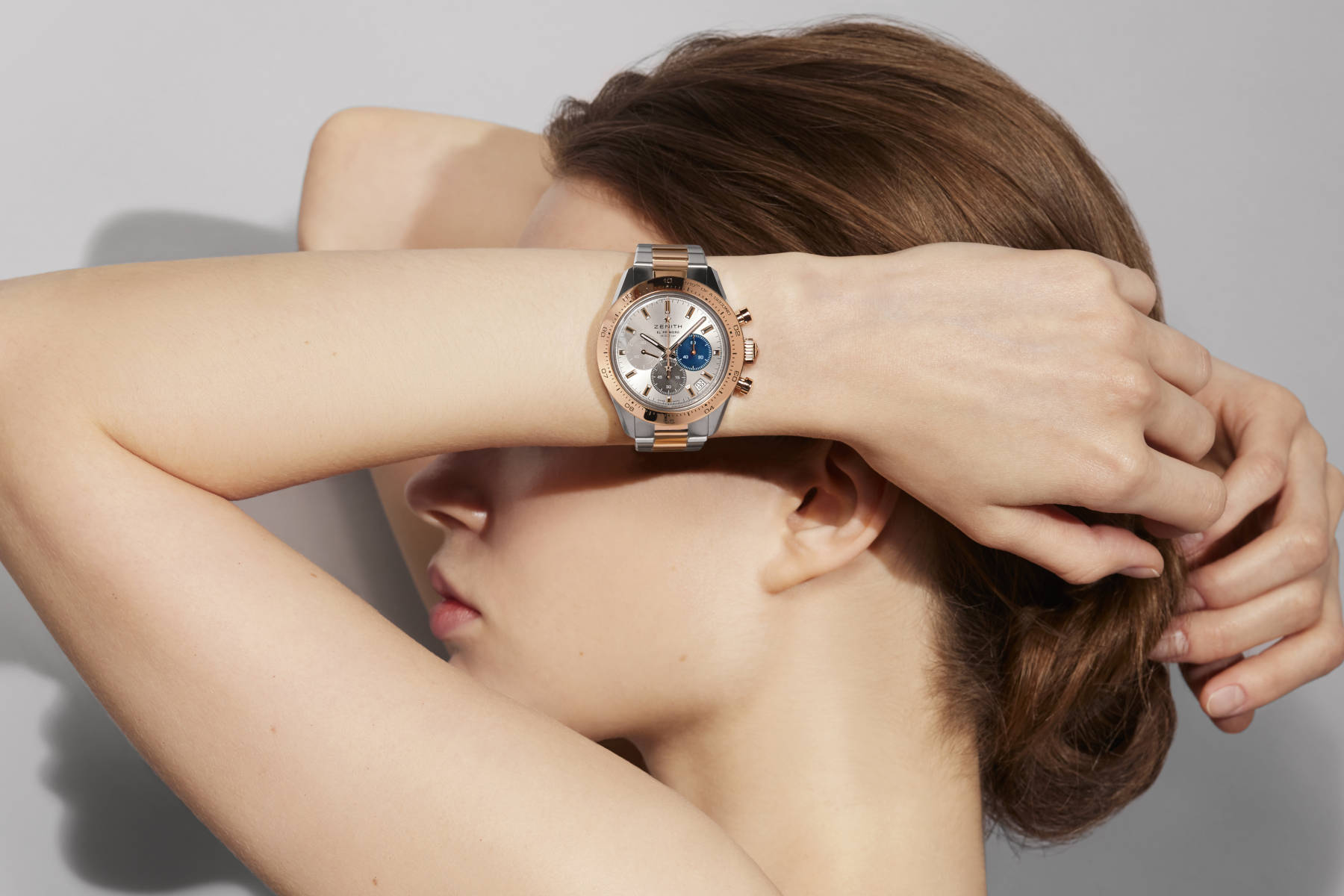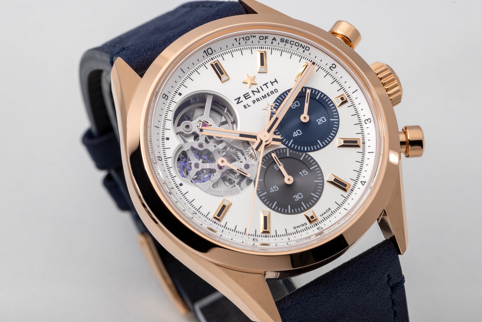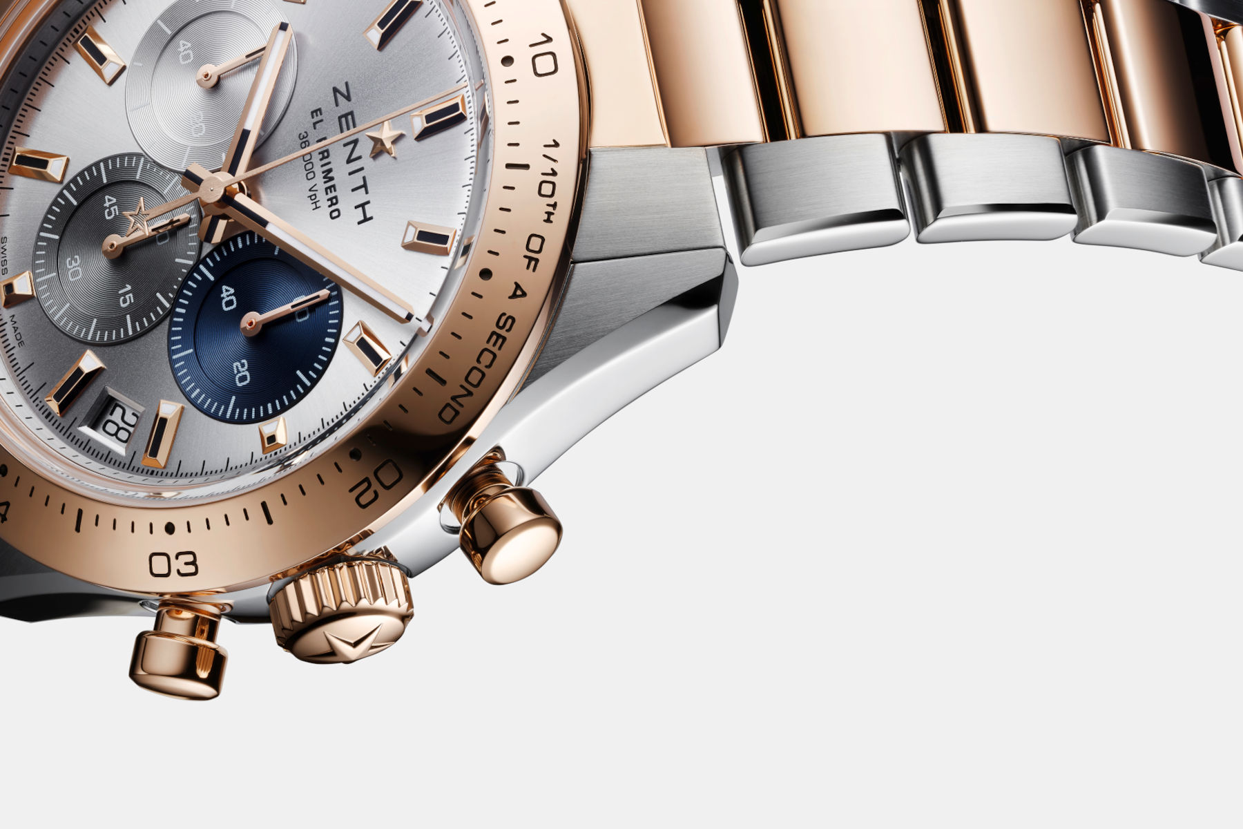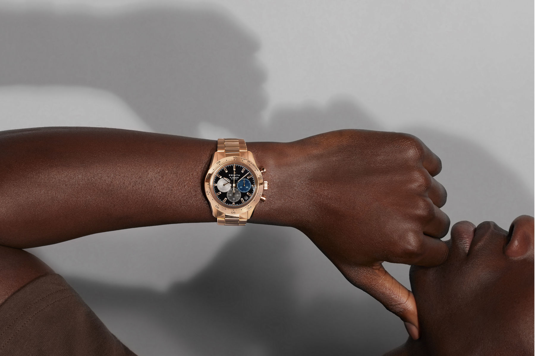 他指的是真力时Chronomaster Sport豪华运动系列腕表。在4月初举办的2022日内瓦腕表与奇迹高级钟表展上,真力时发布了全新贵金属版Chronomaster Sport腕表,包含一款玫瑰金款和一款精钢混玫瑰金的双色款。