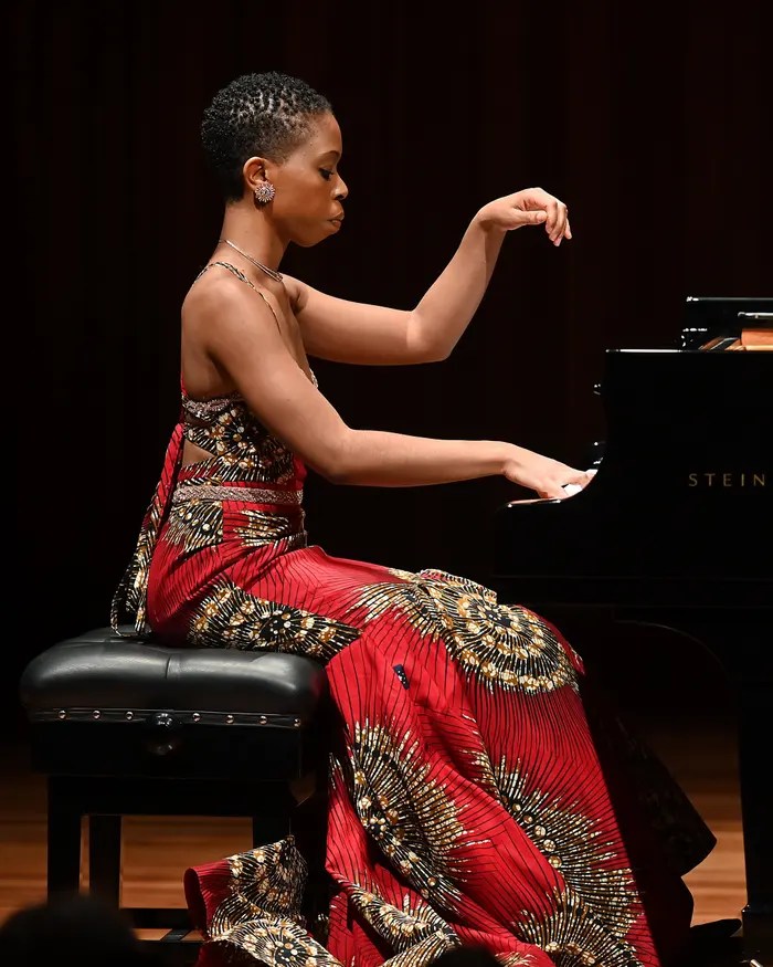对埃格和其他许多独奏家来说,服装是表演的重要组成部分。她说:“这给了我表达自己的机会。我考虑到了颜色和情绪,以及服装会给我和观众带来什么感觉。”她的裙子来自M.A.DKollection,是专为巴比肯的演出设计的。“古代和现代……在设计中融合,有力地说明了我的研究和曲目中的主题。我推崇的是黑人文艺复兴时期的钢琴音乐,这个时代反映了文化复兴的主题,同时也向过去致敬,但带有一种以非洲为中心的转折。这在很大程度上概括了我与音乐会服装的关系!”