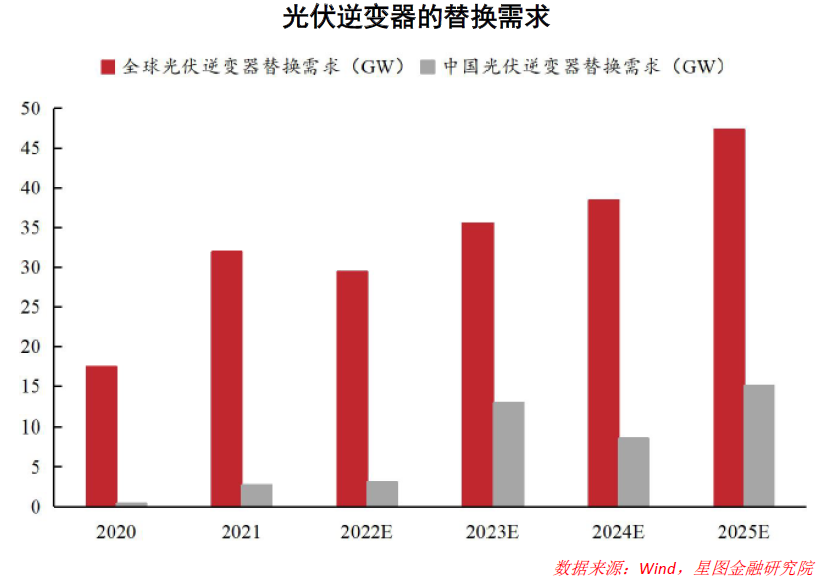 除了新增装机的需求外,存量替换是逆变器的另一大需求增长点。逆变器是光伏电站不可或缺的组成部分,一般而言,光伏电站平均可用年限在25 年左右,而逆变器的使用寿命仅为10年左右,因此存在较大的逆变器替换需求。根据IRENA与国家能源局的数据,2020-2025 年(对应2010-2015 年新增装机量)全球/中国光伏逆变器存量替换需求CAGR 分别为22%/107%。因此,逆变器存量替换需求将是企业的另一增长极。