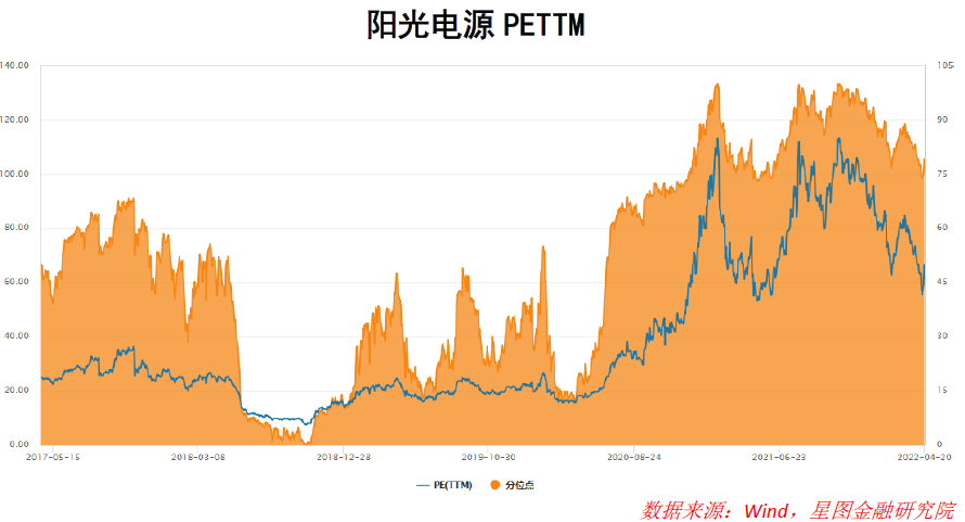 而对于阳光电源企业本身而言,除了行业影响因素外,其价格及估值也同样值得高度关注。疫情之前,其市盈率估值长期维持在40倍以下,在2018年最低点甚至达到8倍左右。但在疫后宽松货币政策及行业高景气的预期下,其PETTM一度在2021年2月份最高达到了113倍的高点。如今股价从最高点回撤近60%,但PETTM估值也仍然超过60,这与其归母净利润同比下降19%的增速相比,也仍然并不算低。