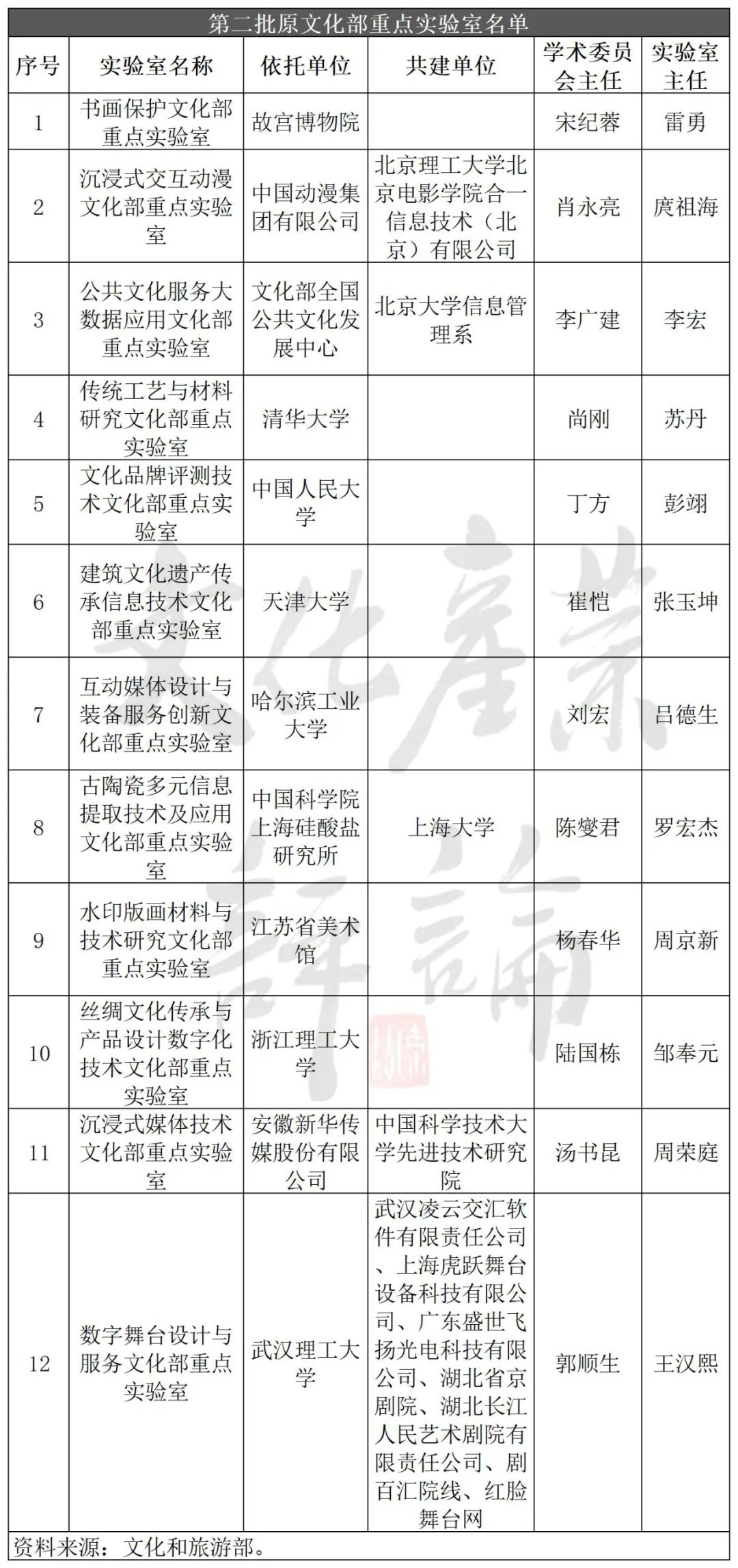 2017年1月,在推荐的基础上,经组织专家评审、实地考察和公示等程序,原文化部公布了第二批文化部重点实验室名单,分别涉及书画保护、沉浸式交互动漫、公共文化服务大数据应用、传统工艺与材料研究、文化品牌评测技术、建筑文化遗产传承信息技术等12个领域重点项目。