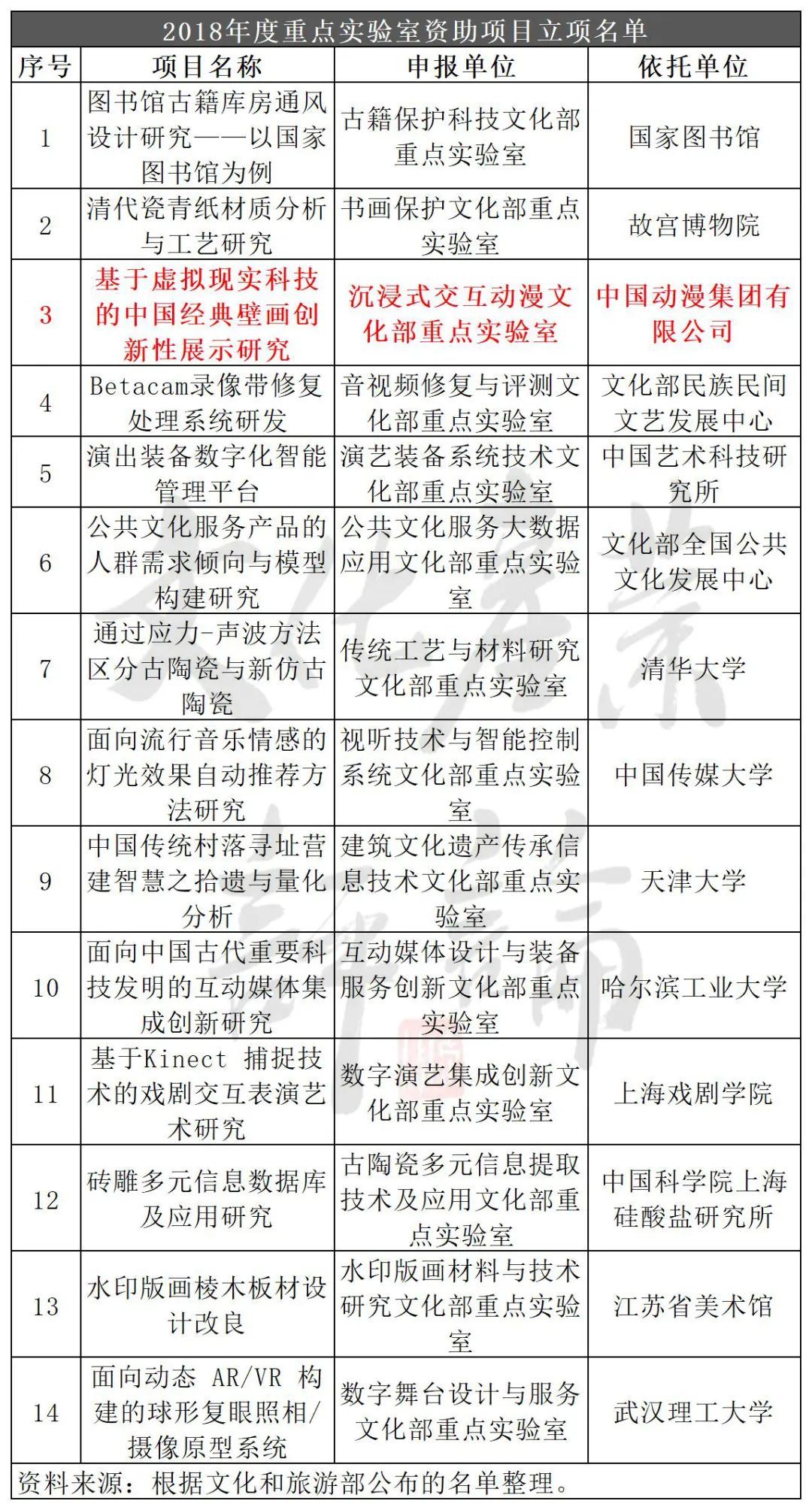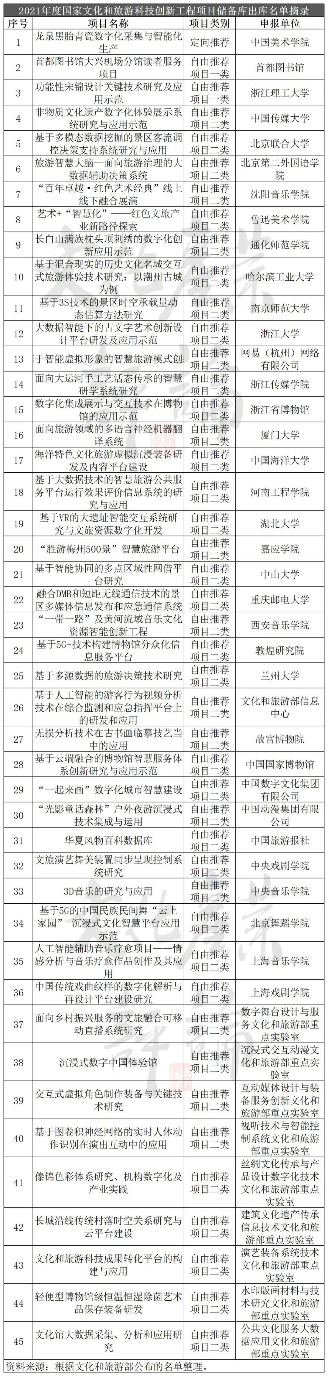 去年8月,文化和旅游部开展了2021年度国家文化和旅游科技创新工程项目评审入库工作,共有100个国家文化和旅游科技创新工程项目储备库出库。其中,涉及重点实验室、依托单位及院校的项目就多达40余项(详见下表),占总数的45%以上,有力推动了实验成果项目化转化率,进一步激发了文化科技创新动能。