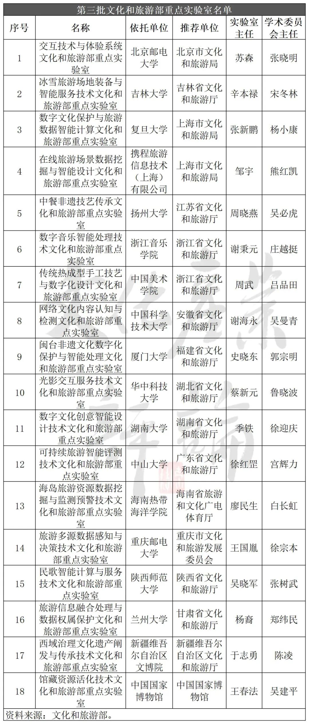 2021年5月,文化和旅游部公布了第三批文化和旅游部重点实验室名单,认定“交互技术与体验系统”“冰雪旅游场地装备与智能服务技术”“在线旅游场景数据挖掘与智能设计”等18家重点实验室为第三批文化和旅游部重点实验室。至此,文化和旅游部重点实验增至37家。