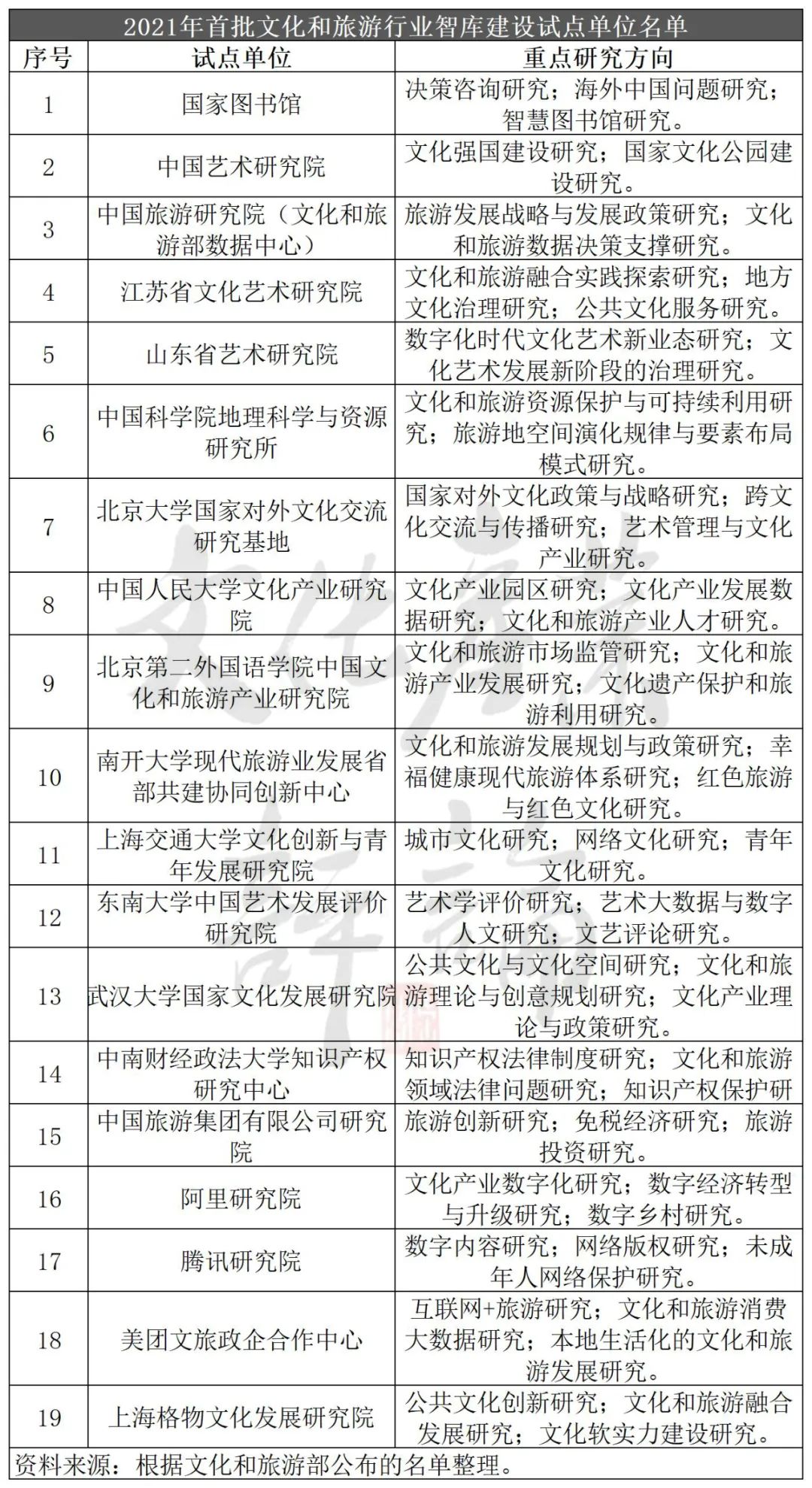 此外,在文化与科技融合体系建设方面,重点实验室建设外,2021年文旅部还遴选确定国家图书馆等19个单位入选首批文化和旅游行业智库建设试点单位(详见下表),并会同科技部、中宣部等相关部门先后分四批共认定85家文化与科技融合示范基地,形成全方位、多层次、开放式创新发展格局(独家解读 | 10年4批85家,国家文化和科技融合示范基地)。