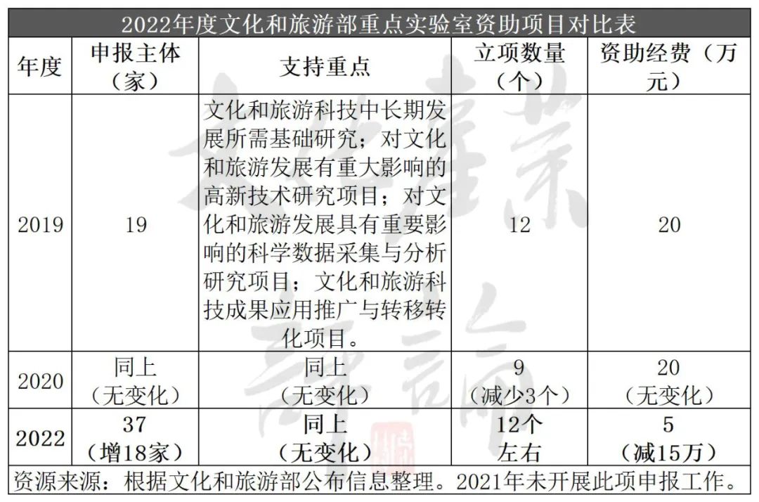 综合前文分析,文化产业评论(ID:whcypl)发现,此次文化和旅游部重点实验室资助项目与上几个年度相比较(详见下表),在项目支持方向、申报数量并没有明显变化,唯一存在差异化的是申报主体增加近50%、项目资助经费额度却削减了75%。