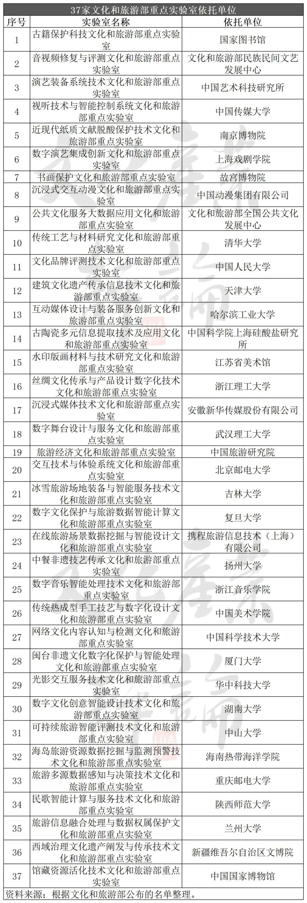 日前,文化和旅游部办公厅发布《关于申报2022年度文化和旅游部重点实验室资助项目的通知》,项目面向37家文化和旅游部重点实验室定向申报。那么,什么是文化和旅游部重点实验室?这37家实验室都有哪些单位、具体做什么?近年来又取得了哪些重要研究成果?今天文化产业评论(ID:whcypl)将带大家一探究竟。