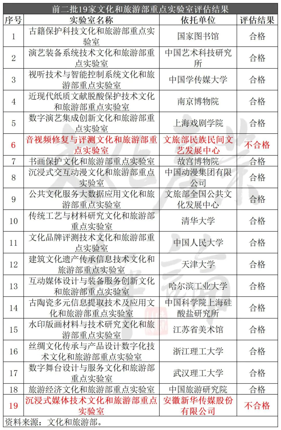 2020年7月,为促进实验室可持续发展,提升实验室创新能力和水平,文旅部按照《文化和旅游部重点实验室评估规则》,对前二批全部19家文化和旅游部重点实验室开展了评估工作,评估结果分为“合格”“不合格”两个等级,并于同年11月公布了重点实验室评估结果。其中,17家单位评估结果为“合格”,2家单位评估结果为“不合格”。