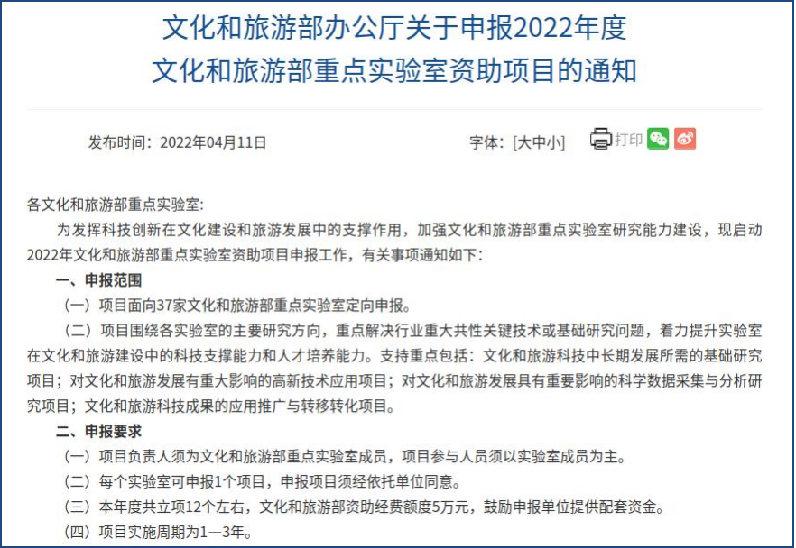 近日,文化和旅游部办公厅发布《关于申报2022年度文化和旅游部重点实验室资助项目的通知》,项目面向37家文化和旅游部重点实验室定向申报,旨在发挥科技创新在文化建设和旅游发展中的支撑作用,加强文化和旅游部重点实验室研究能力建设。