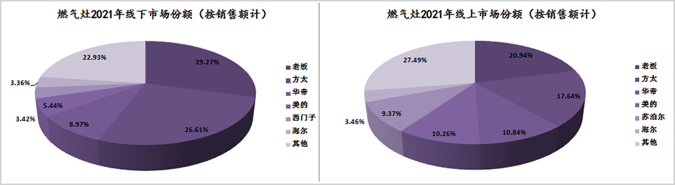 2021年,在油烟机、燃气灶、消毒柜、洗碗机、嵌入式复合机、嵌入式单功能电烤箱、嵌入式单功能电蒸箱等7个主要厨电大品类的线下市场中,老板电器拿了4个第一、3个第二,方太则拿了1个第一、3个第二。
