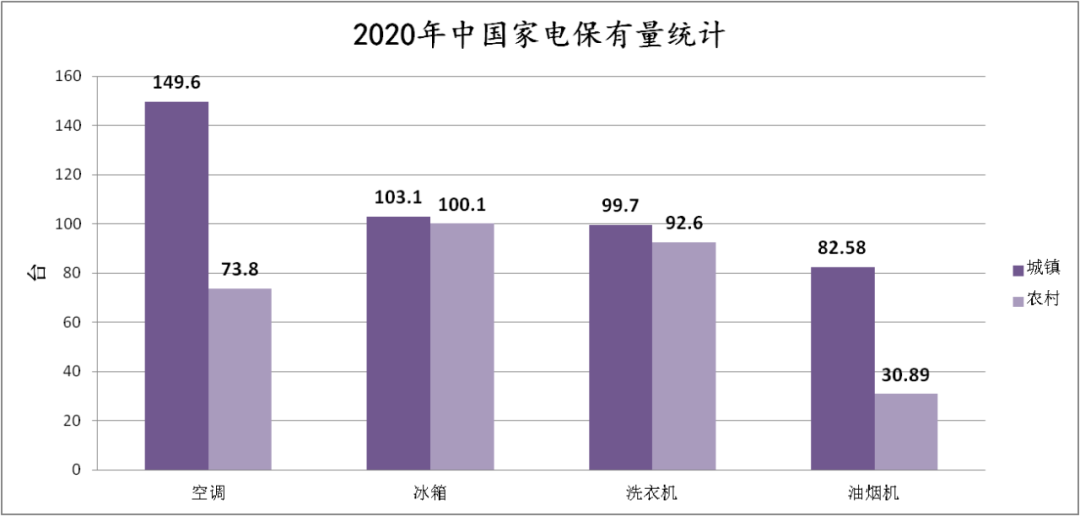 根据国家统计局的数据,2020年,我国城镇家庭中空调、冰箱、洗衣机的保有量已分别达到149.6、103.1、99.7台/百户,而同期油烟机的保有量仅为82.58台/百户;农村地区的差距更为悬殊,空调、冰箱、洗衣机的保有量已分别达到73.8、100.1、92.6台/百户,但油烟机只有30.89台/百户。