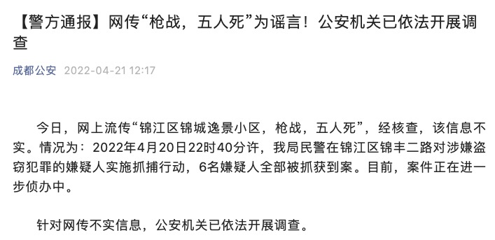 据“成都公安”微信公众号消息,今日,网上流传“锦江区锦城逸景小区,枪战,五人死”,经核查,该信息不实。情况为:2022年4月20日22时40分许,成都市公安局民警在锦江区锦丰二路对涉嫌盗窃犯罪的嫌疑人实施抓捕行动,6名嫌疑人全部被抓获到案。目前,案件正在进一步侦办中。