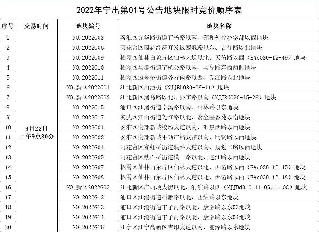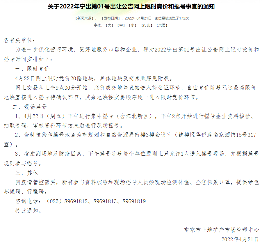 刚刚,南京土地市场网发布重要公告《关于2022年宁出第01号出让公告网上限时竞价和摇号事宜的通知》,通知中明确了出让时间、具体地块、交易顺序等。