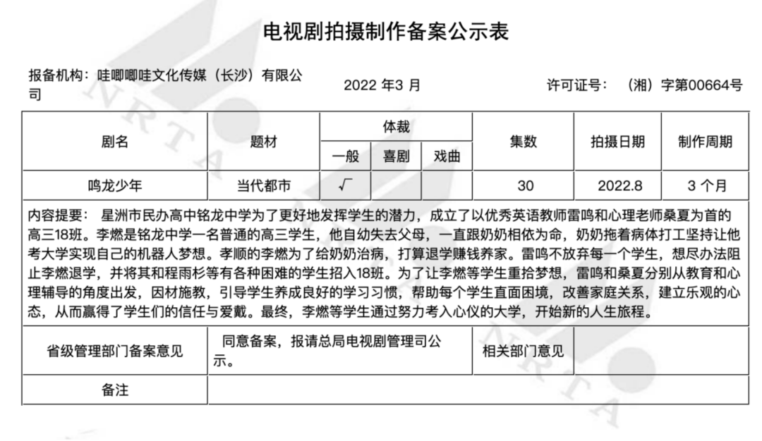 哇唧唧哇《鸣龙少年》疑似翻拍日剧《龙樱》,原作讲述阿部宽饰演的暴走族律师带领龙山高中后进生们顺利考入东京大学的热血故事,《鸣龙少年》则以英语教师雷鸣和心理老师桑夏为核心,讲述他们引导面对不同困境学生直面挑战最终开启人生崭新旅程的故事。