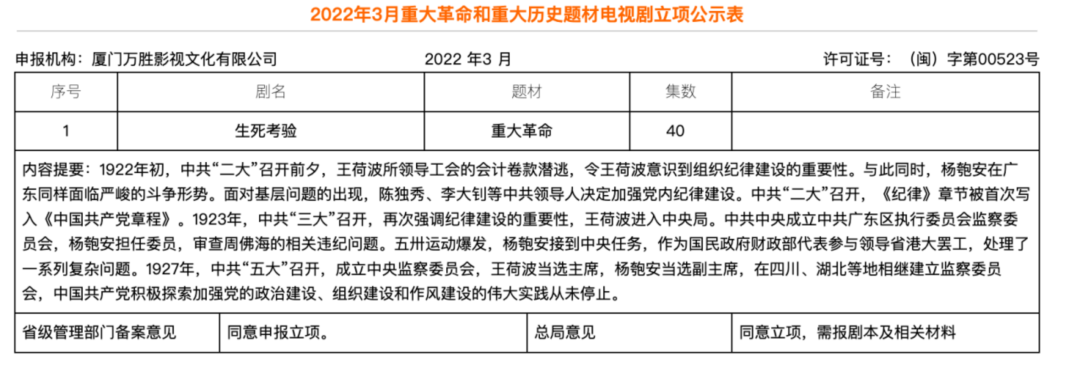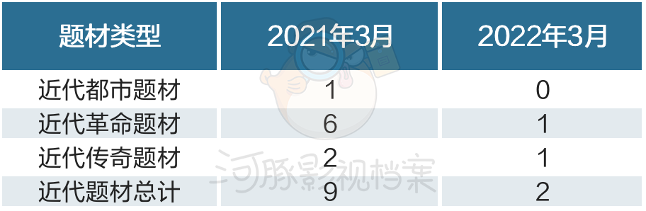 无论是与2022年前两个月份纵向比较还是与去年同期对比,3月份近代题材尤其是革命题材类型的备案数量有较大幅度的减小。相比去年建党100周年的背景带来的近代革命题材的“扎堆“,3月份立项的重大革命题材电视剧《生死考验》的故事开始于1922年中共“二大”召开前夕,一直到1927年中共“五大”召开,故事始终围绕党内组织纪律建设,可以看做是对今年即将召开的二十大的一个呼应。