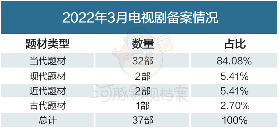 近日,广电总局公布了3月份电视剧拍摄制作备案情况,2022年3月电视剧备案共计37部、1156集,备案总数相比2月的33部略有上升,但与去年同期相比下降15%。题材方面,当代题材为32部,现代题材为2部,近代题材为2部,古代题材为1部,重大革命题材电视剧目为1部。