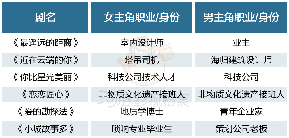 主角职业类型体现出多样化的同时,从主题落点上来看,恋爱双方个人的职业成长与爱情的美满始终被放置于同等重要的位置。