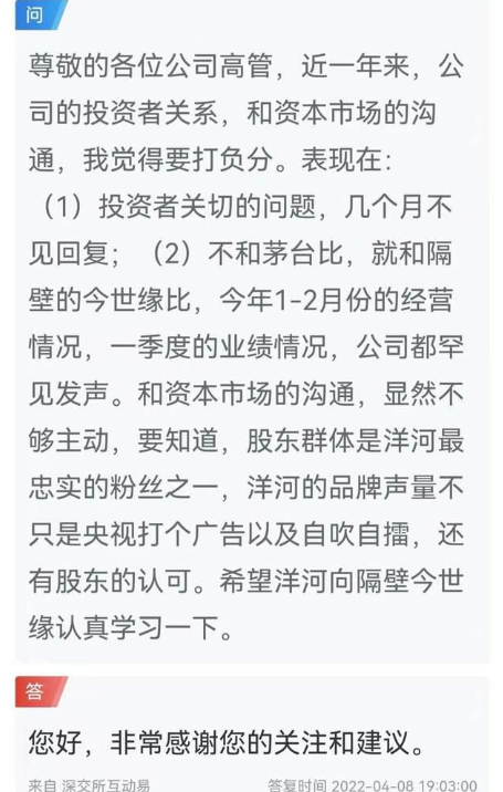 比如洋河,在互动易上,有投资者发帖称要给公司高管打负分。他的理由一是认为洋河股份对于投资者关切的问题几个月不见回复;二是和资本市场的沟通不够主动。