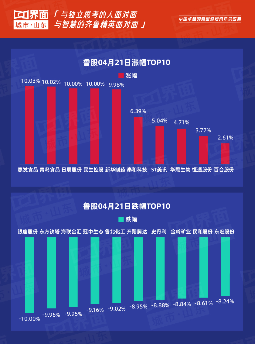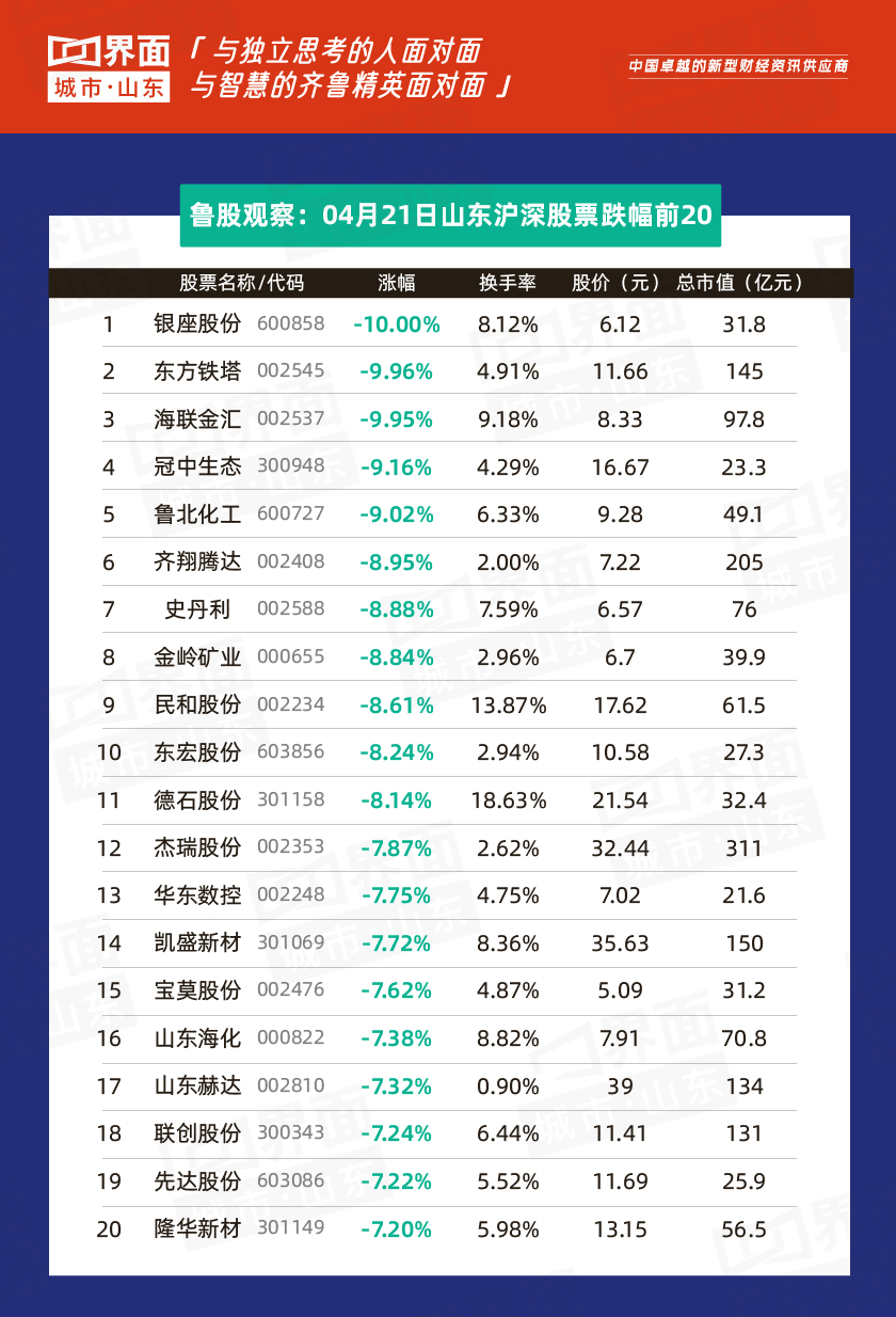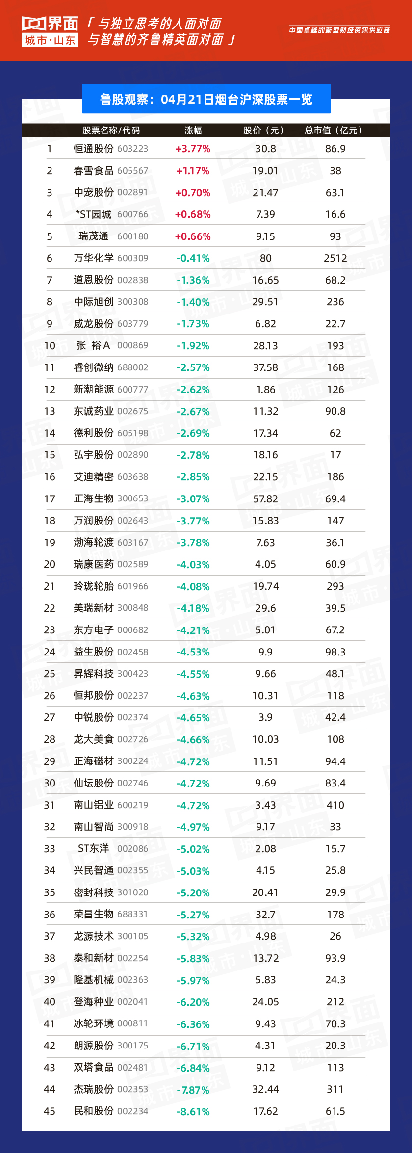 4月21日,山东省内沪深股票有24只个股上涨,241只个股下跌;总市值过千亿的有万华化学(600309)、海尔智家(600690)、兖州煤业(600188)、歌尔股份(002241)、潍柴动力(000338)、青岛啤酒(600600)、中航沈飞(600760)共7家,500亿-1000亿的共有4家,分别是山东黄金(600547)、华鲁恒升(600426)、华熙生物(688363)、中泰证券(600918)。