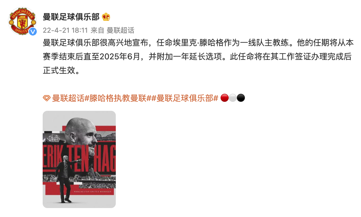 4月21日,曼联足球俱乐部宣布,任命埃里克·滕哈格作为一线队主教练。他的任期将从本赛季结束后直至2025年6月,并附加一年延长选项。此任命将在其工作签证办理完成后正式生效。