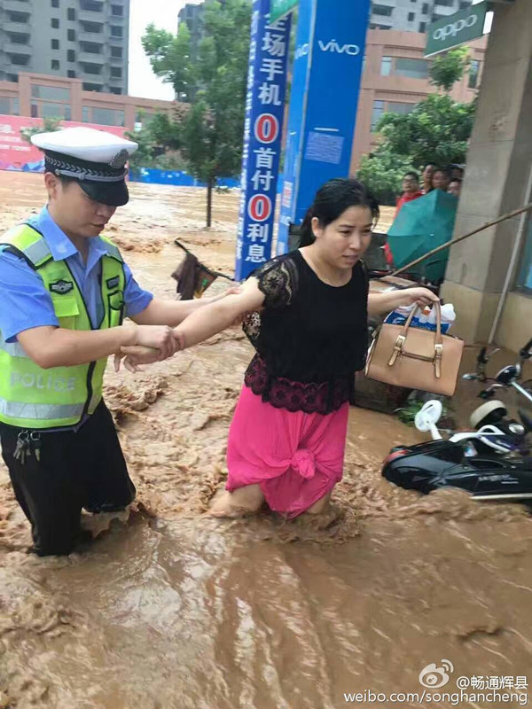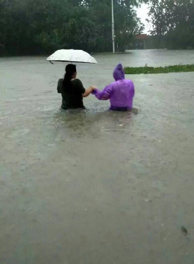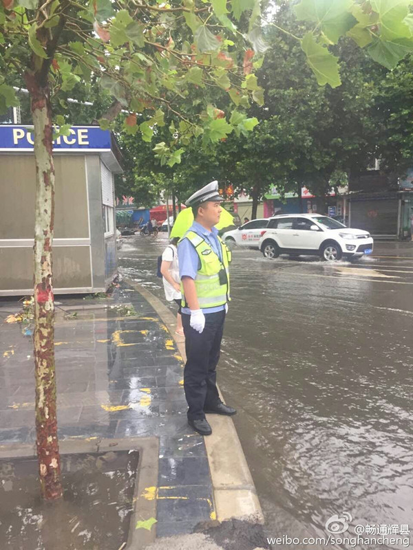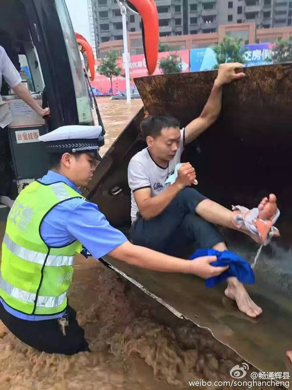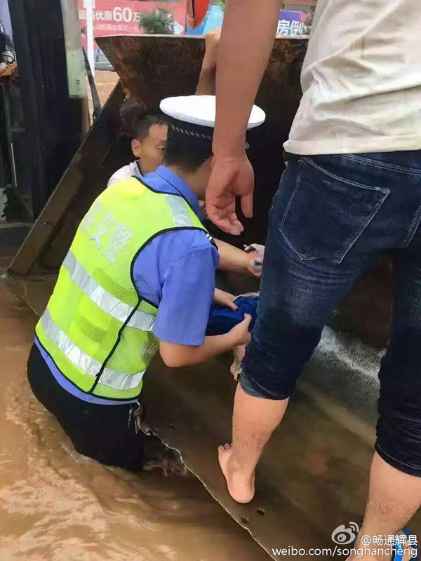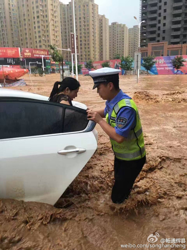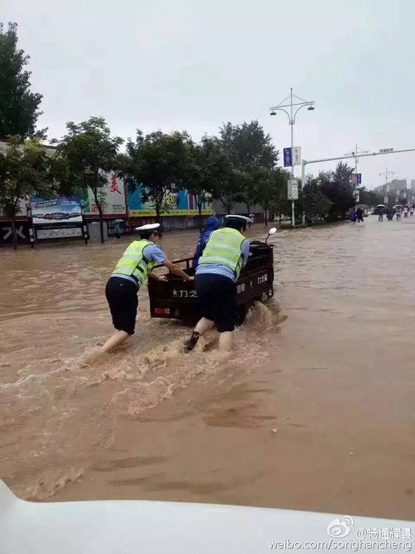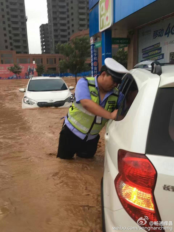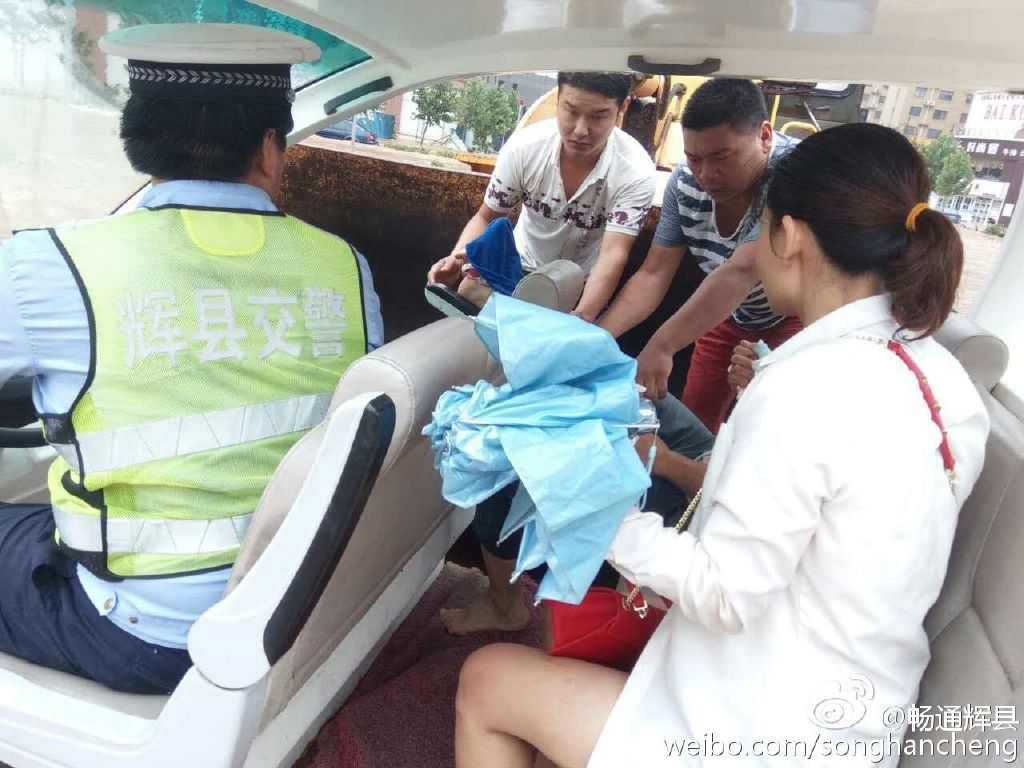 辉县市公安交警大队官方微博发布图片显示,辉县市出现渍涝,水位直达腰部。